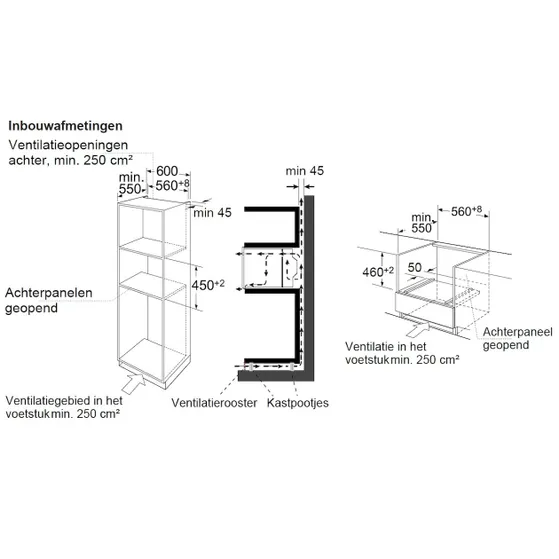 De EBM4543-30 is ontworpen voor inbouw met een nishoogte van 45 cm (inbouwmaten ca. 450 × 560 × 550 mm). De buitenafmetingen zijn circa 460 × 600 × 570 mm. Dankzij de compacte hoogte past hij goed in een smalle kolom of boven-/onderkast.