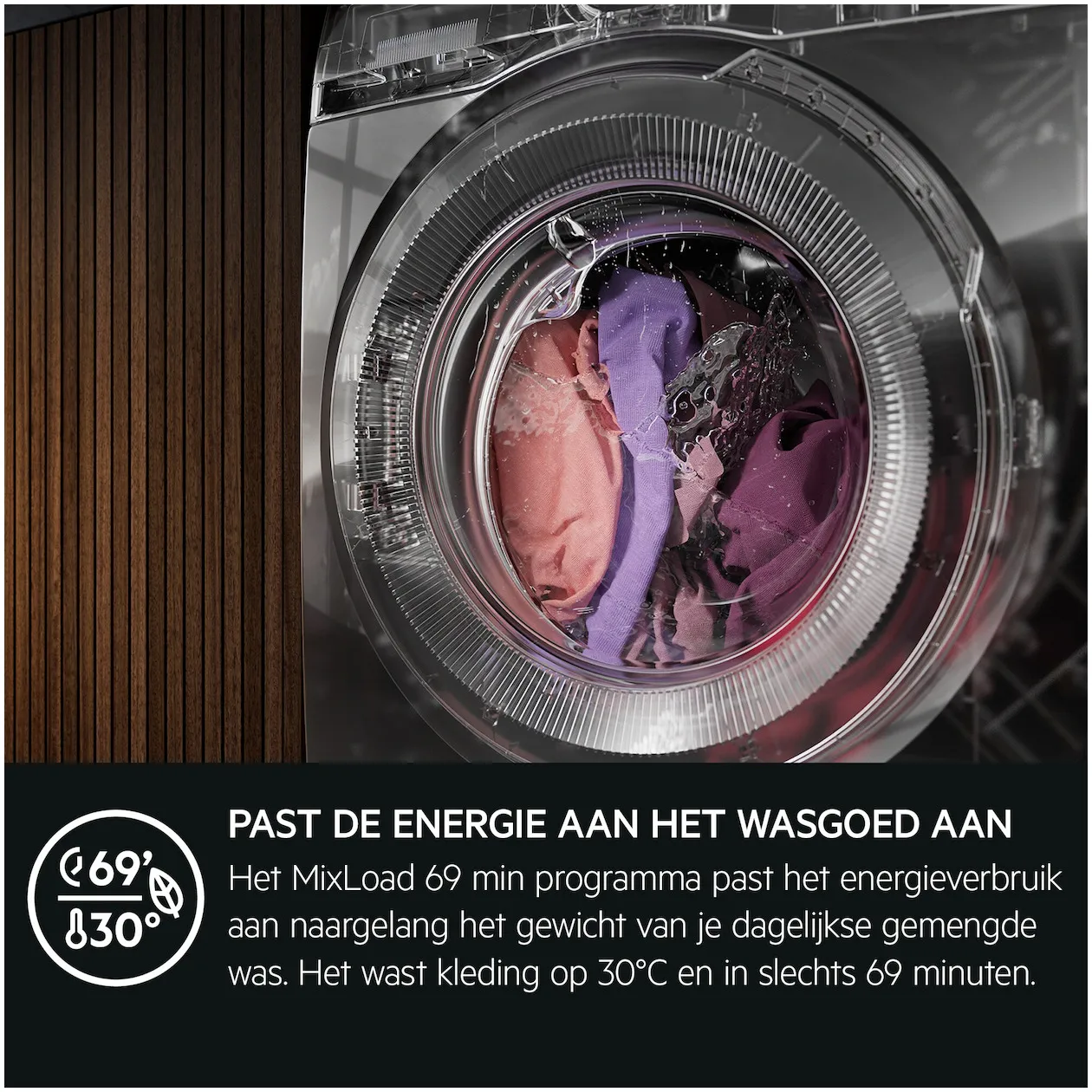 • Wasprogramma's: MixLoad 69min, Eco 40-60, Katoen, Synthetica, Delicates, Wol, 20min 3Kg, Steam, Machine Clean, Hygiene, Spoelen, Centrifugeren/Pompen
